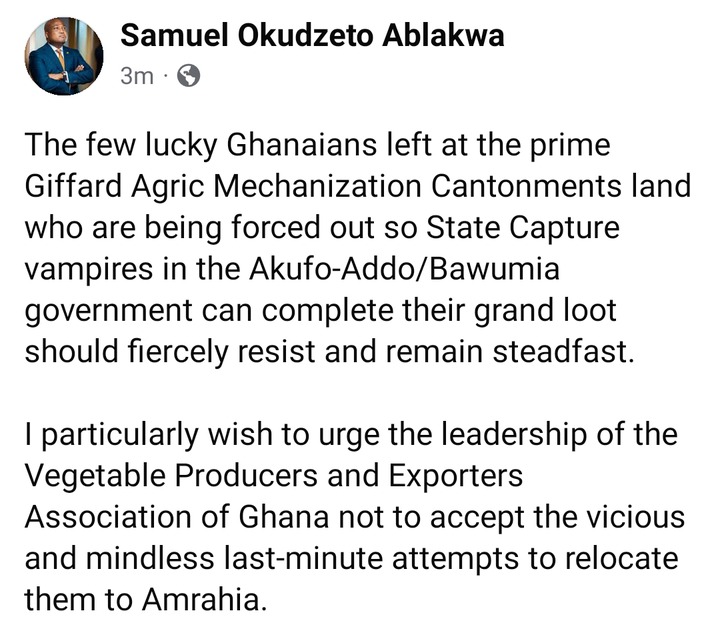 “The few lucky Ghanaians left at the prime Giffard Agric Mechanization Cantonments land who are being forced out so State Capture vampires in the Akufo-Addo/Bawumia government can complete their grand loot should fiercely resist and remain steadfast.”