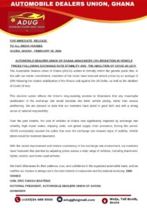 The Automobile Dealers Union of Ghana (ADUG) has announced a 15 percent reduction in vehicle prices, citing the recent stabilization of the Ghana cedi against the US dollar and the abolition of the COVID-19 levy.