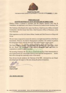 In a press release dated February 27, 2026, the Chief of Staff at Manhyia, Kofi Badu, stated that His Majesty Otumfuo Osei Tutu II, Asantehene, has constituted the new board to oversee the affairs of the club.