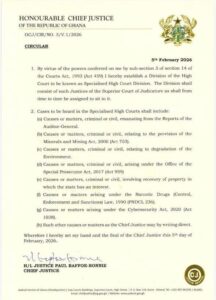 The decision was announced in a circular dated February 5, 2026, and issued under subsection 3 of section 14 of the Courts Act, 1993 (Act 459).