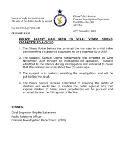 The Criminal Investigation Department (CID) of the Ghana Police Service has arrested a man captured in a viral video administering what is believed to be a cigarette to a young child, an act widely condemned by the public.