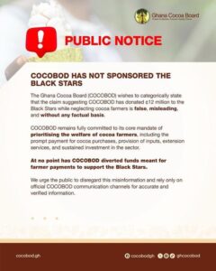 “At no point has COCOBOD diverted funds meant for farmer payments to support the Black Stars,” the notice stressed.