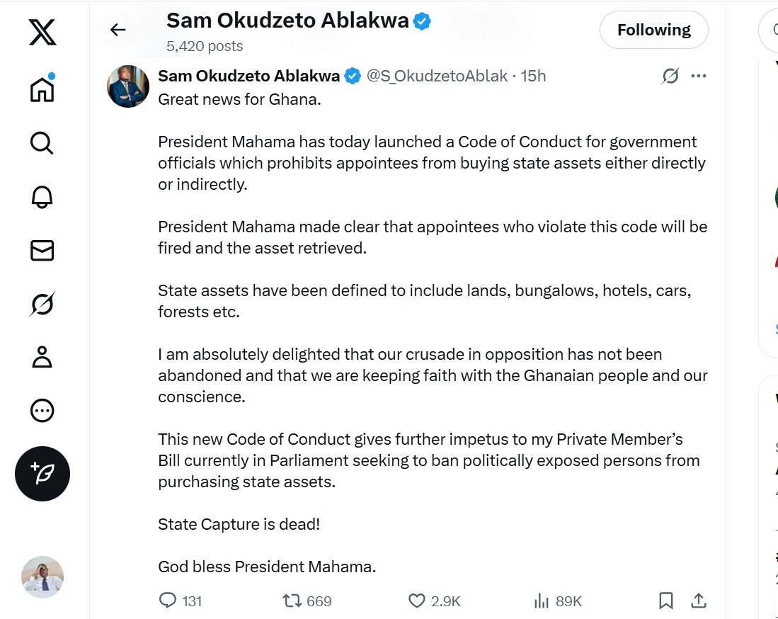 Reacting to this on his X page, Mr Ablakwa, also Member of Parliament for North Tongu, said”Great news for Ghana. President Mahama has today launched a Code of Conduct for government officials which prohibits appointees from buying state assets either directly or indirectly.  President Mahama made clear that appointees who violate this code will be fired and the asset retrieved.