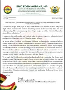 In a statement dated February 17, 2026, the MP raised concerns over portions of the Aki-Ola Series Social Studies textbook which reportedly outline “benefits Ghana has derived from colonization.” He described the content as disturbing and irresponsible, arguing that it attempts to portray colonization as beneficial to Ghanaians and Ghanaian society.