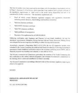 The Ministry commended the Minerals Commission and the Tender Committee for their diligence and reiterated government’s commitment to ensuring the Damang Mine continues to contribute significantly to Ghana’s economy.