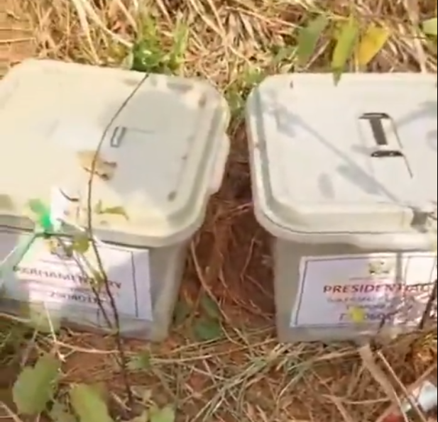 One of the boxes, labeled as a parliamentary ballot box, bore the serial number 290401B and was tagged with the polling station Abrim Ahenkro.