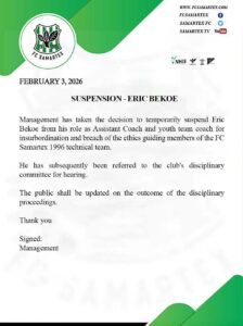 FC Samartex 1996 has not disclosed further details regarding the incident but reiterated its commitment to upholding discipline, professionalism, and ethical conduct within the club.