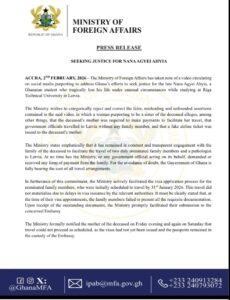 The Ministry of Foreign Affairs has dismissed as false and misleading claims circulating on social media regarding Ghana’s efforts to seek justice for the late Nana Agyei Ahyia, a Ghanaian student who died under unusual circumstances while studying at Riga Technical University in Latvia.