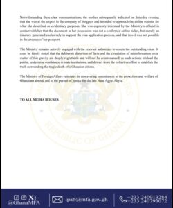 According to the statement, the Ministry has maintained constant and transparent engagement with the family, facilitating arrangements for two duly nominated family members and a pathologist to travel to Latvia. It stressed that at no point was any payment demanded or received from the family, adding that the Government of Ghana is bearing the full cost of all travel-related expenses.