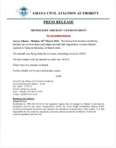 In a press statement issued in Accra, the Authority said the aircraft, with registration number 9GADV, was en route from Ho to Accra when the incident occurred.