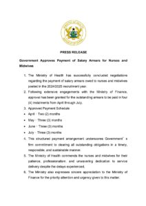 The Ministry of Health Ghana has announced the approval of a structured payment plan to clear outstanding salary arrears owed to nurses and midwives recruited during the 2024/2025 recruitment year.