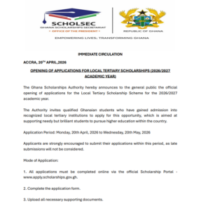In a statement issued in Accra on April 20, 2026, the Secretariat—under the Office of the President—invited qualified Ghanaian students who have secured admission into recognized tertiary institutions across the country to apply. The scholarship scheme is designed to support academically gifted but financially disadvantaged students in pursuing higher education.