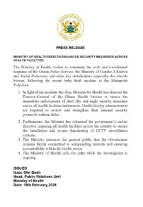 The statement indicated that the Minister for Health has instructed the Director-General of the Ghana Health Service to ensure the strict implementation of day and night security protocols in all health facilities. Administrators have also been directed to urgently review and strengthen their internal security systems.