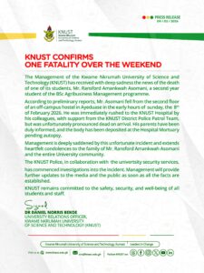 The management of the Kwame Nkrumah University of Science and Technology (KNUST) has confirmed the death of one of its students following an incident over the weekend.