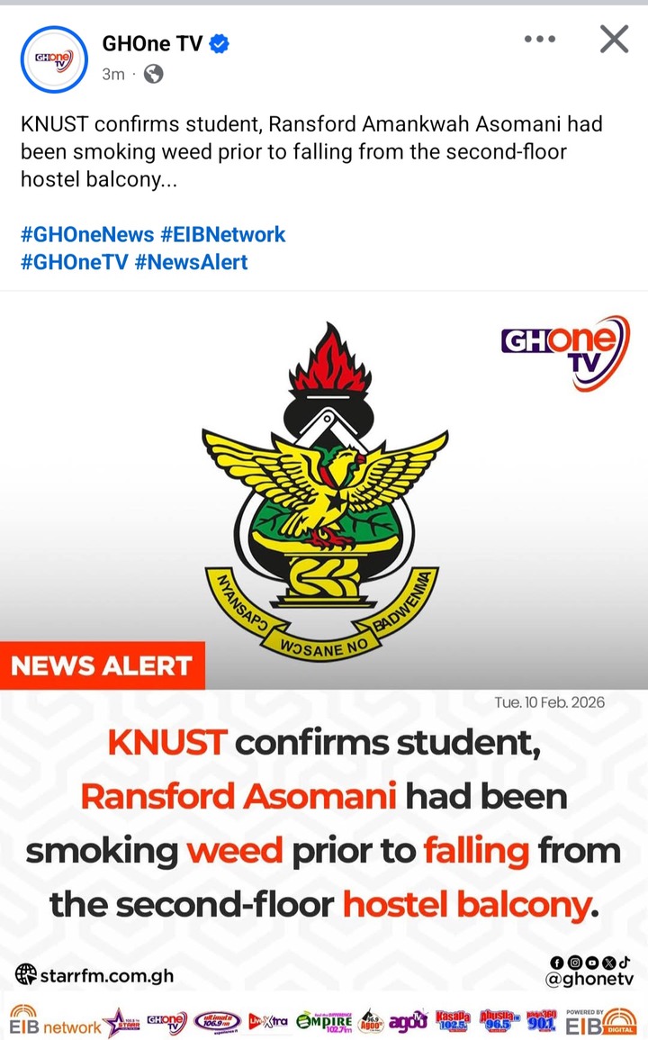 KNUST authorities have not yet released detailed information about Asomani’s current medical condition or the extent of injuries sustained from the fall. However, the confirmation of drug use before the accident has prompted immediate discussions about campus safety and student welfare policies.