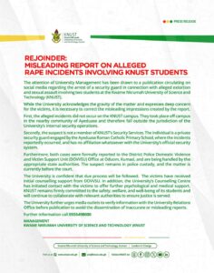 The Kwame Nkrumah University of Science and Technology (KNUST) has issued a strong rejoinder to what it describes as misleading reports circulating on social media regarding alleged rape incidents involving its students.