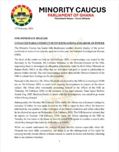 The Minority Caucus in Parliament has strongly condemned what it describes as the unacceptable conduct of the National Investigations Bureau (NIB) in its handling of an investigation involving  Kofi Ofosu Nkansah, accusing the agency of abuse of power and infringement of fundamental human rights.
