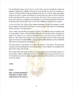 Describing the development as a threat to Ghana’s democracy and the rule of law, the Minority Caucus accused the government of using state security agencies to intimidate citizens who express views critical of the administration.