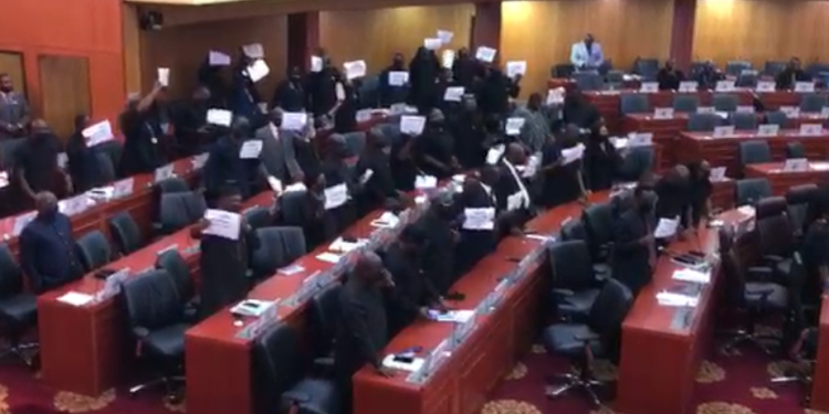 Minority MPs, dressed in black, chanted patriotic songs, banged tables, and hooted at the Clerk of Parliament, Ebenezer Ahumah Djietror, who had earlier attempted to maintain order.
