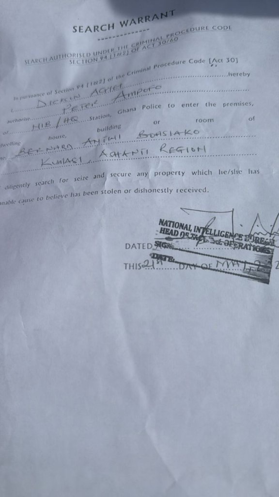 While a search warrant was sighted by Joy News, the specific reasons behind the raid remain unclear.