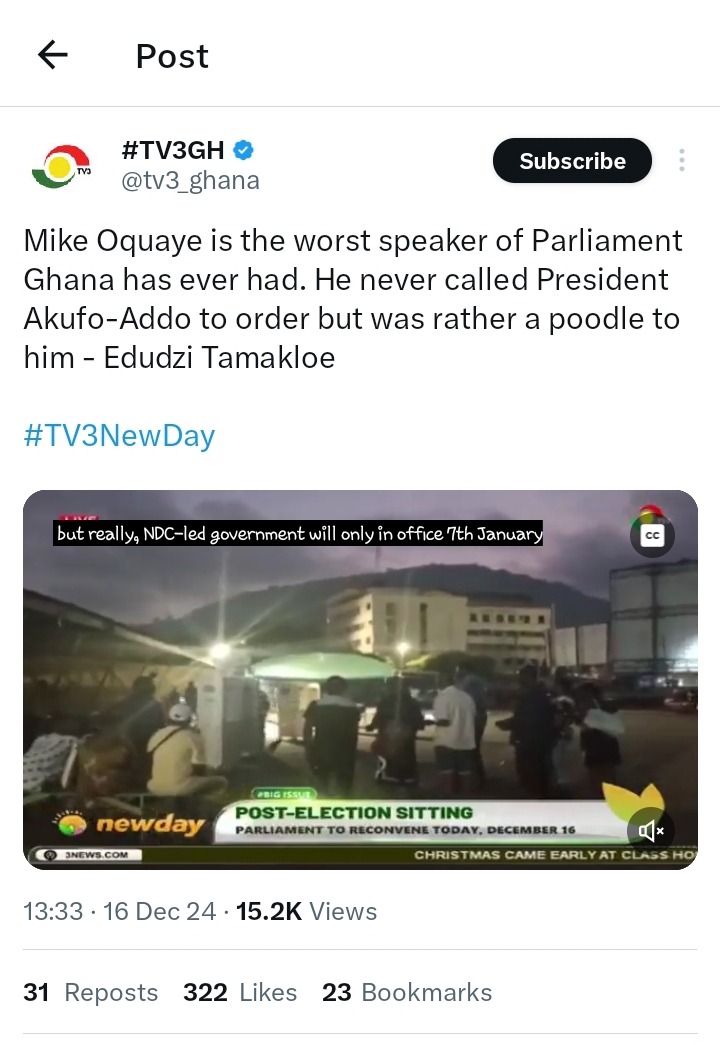 Speaking on TV3’s New Day, Tamakloe labeled Oquaye as the “worst Speaker of Parliament Ghana has ever had,” citing what he described as a lack of impartiality during Oquaye’s tenure.