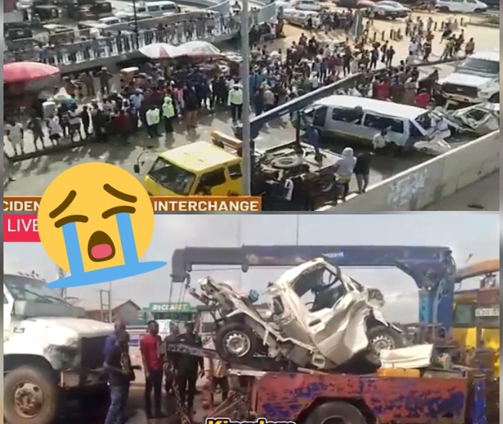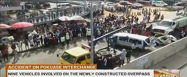 Nine vehicles where involved in a fatal road accident on Pokuase Interchange on the newly contracted overpass. The pictures from the accident scene is very terrible and people can be seen from the video taking aback as a result of the nature of the accident.