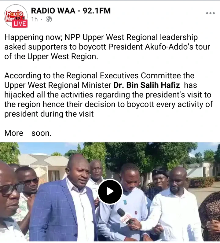 According to the leadership of the party in Upper West region, the regional minister, Dr. Bin Salih Hafiz has hijacked the entire activities regarding the president’s visit to the region, hence their decision to leave everything to him and boycott every activity of the president during his tour.