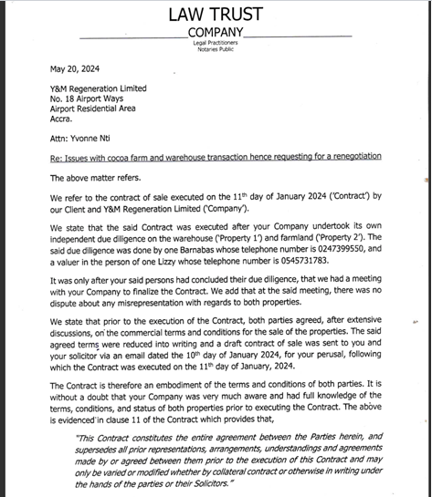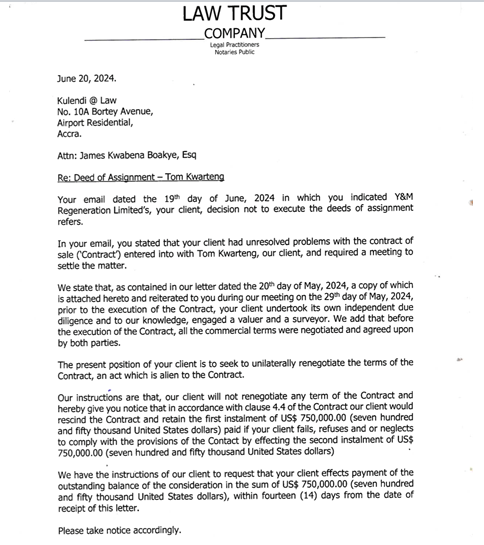 Following multiple negotiations with Law Trust, represented by Samuel Codjoe, a Managing Partner of the firm and his client, Kwarteng, Yvonne Nti raised funds with support from her business partners and made an initial payment of $750,000.