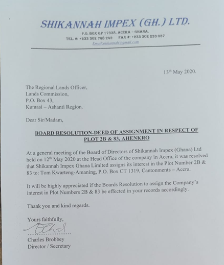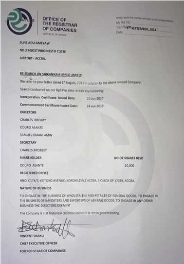 Shikannah Impex, the company purportedly transferring ownership, had only one legitimate shareholder, yet fake board resolutions were signed by another individual, Charles Brobbey.