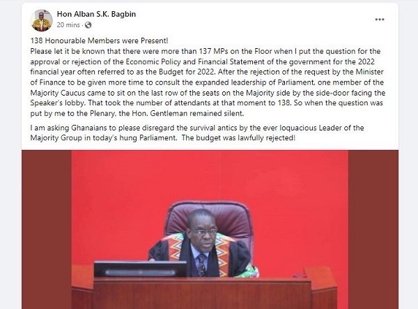 “Please let it be known that there were more than 137 MPs on the floor when I put the question for the approval or rejection of the Economic Policy and Financial Statement of the government for the 2022 financial year often referred to as the Budget for 2022,” he wrote in a Facebook post.