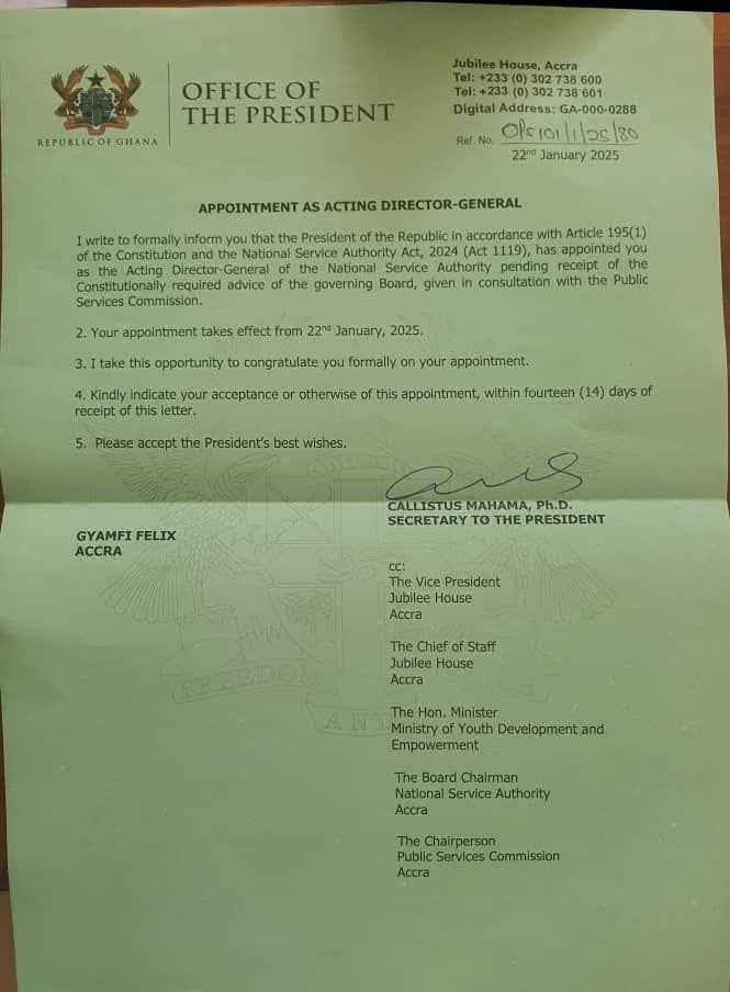President John Dramani Mahama has appointed Gyamfi Felix as the acting Director-General of the National Service Authority, effective January 22, 2025.
