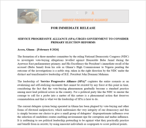 The Service Progressive Alliance (SPA) has urged the government and political stakeholders to consider reforms in Ghana’s primary election systemfollowing the recent formation of a three-member committee by the National Democratic Congress (NDC) to investigate vote-buying allegations against Honorable Baba Jamal during the Ayawaso East parliamentary primaries.