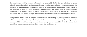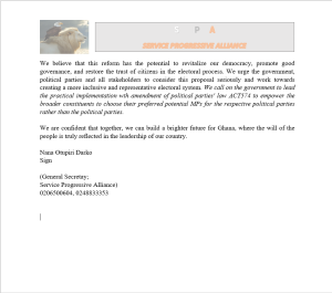 The SPA proposed that Ghana move toward a more inclusive primary election process, allowing all eligible voters in a constituency, regardless of political affiliation, to participate in the selection of candidates. The alliance believes this approach would reduce the influence of money and party leadership on election outcomes, increase transparency and accountability, and ensure that candidates are truly representative of the people they seek to serve.