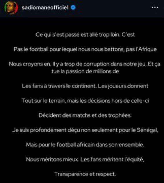 “Players give everything on the pitch, but decisions off it are deciding matches and trophies. I’m deeply disappointed not just for Senegal, but for African football as a whole. We deserve better. The fans deserve fairness, transparency, and respect.”